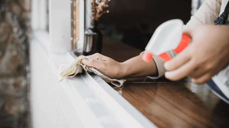 - Use a soapy water or vinegar water solution in a spray bottle to apply on the window frames. You can also use a multi-purpose spray to wipe down window frames.